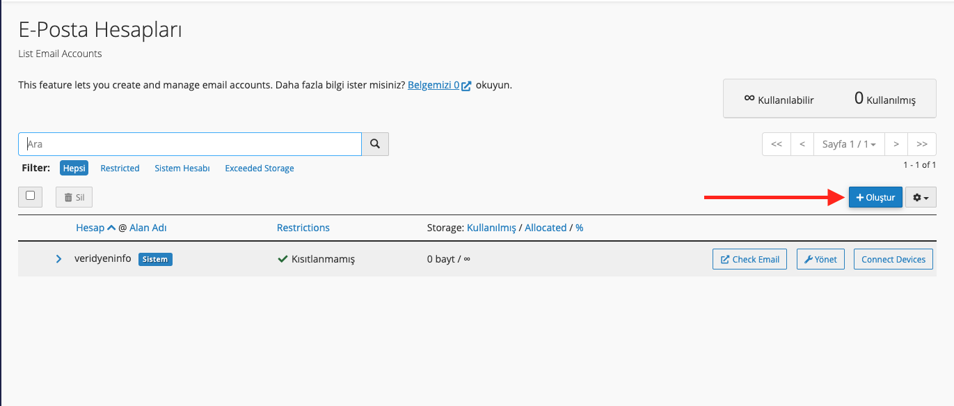 - Aldığınız hizmette email hesabı açabilmeniz için en az 1 veya daha fazla email hesabı limitiniz olmalıdır.
