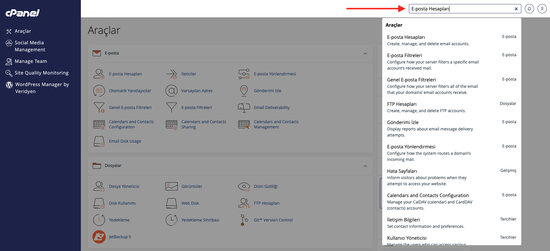 E-Posta sekmesi altında yer alan E-posta hesapları bağlantısına tıklayın. Dilerseniz arama kısmına da Posta yazıp aratabilirsiniz. Eğer cPanel’i İngilizce kullanıyorsanız Email Accounts olarak yer almaktadır.