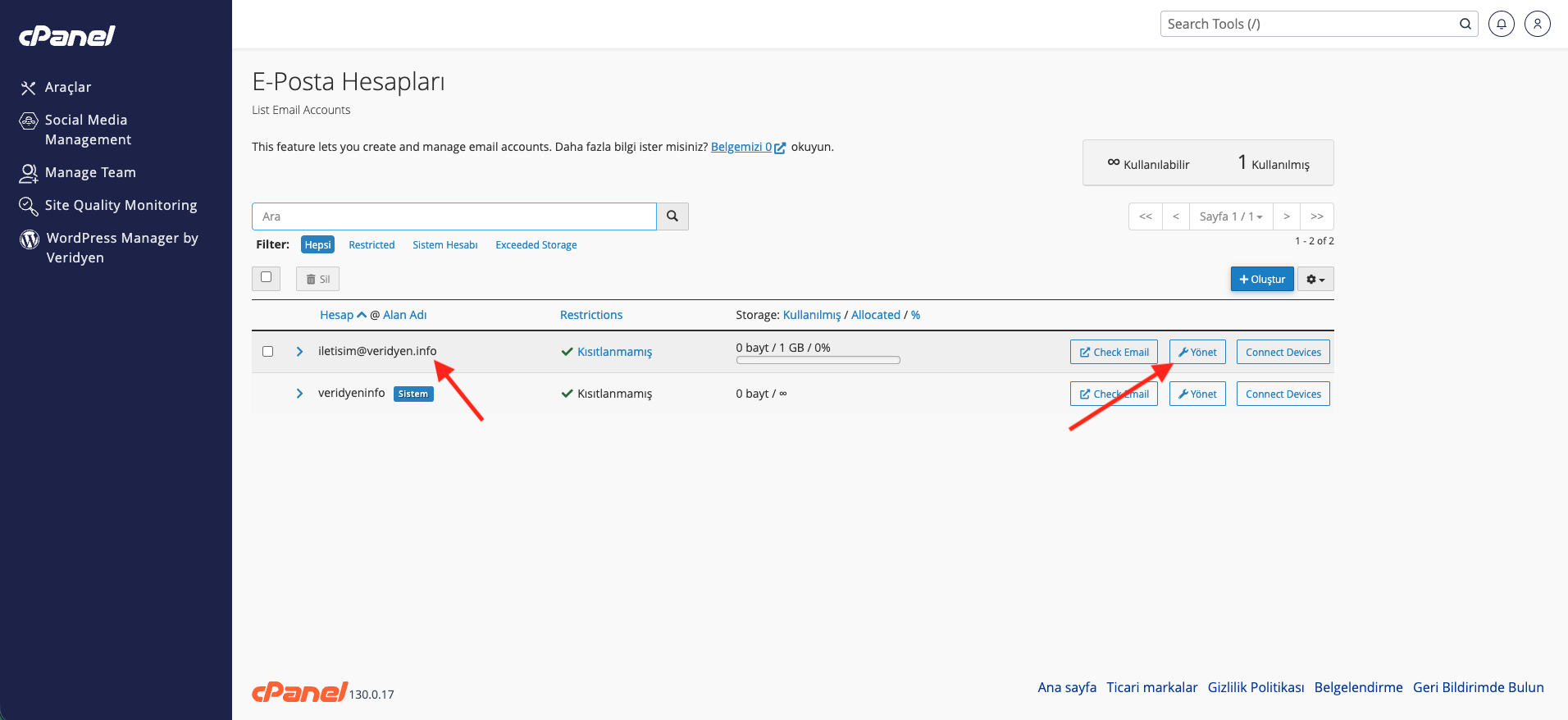 Bu alanda size ait olan E-Posta hesaplarını göreceksiniz. Şifresini değiştirmek istediğiniz E-Posta hesabının sağındaki Yönet butonuna tıklayın.