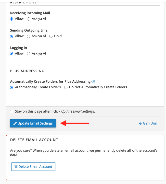 Yeni şifrenizi belirledikten sonra Update Email Settings butonuna tıklayın. Butona bastıktan sonra yeni şifreniz yukarıda Yeni şifre alanında yazan şifre olucaktır.