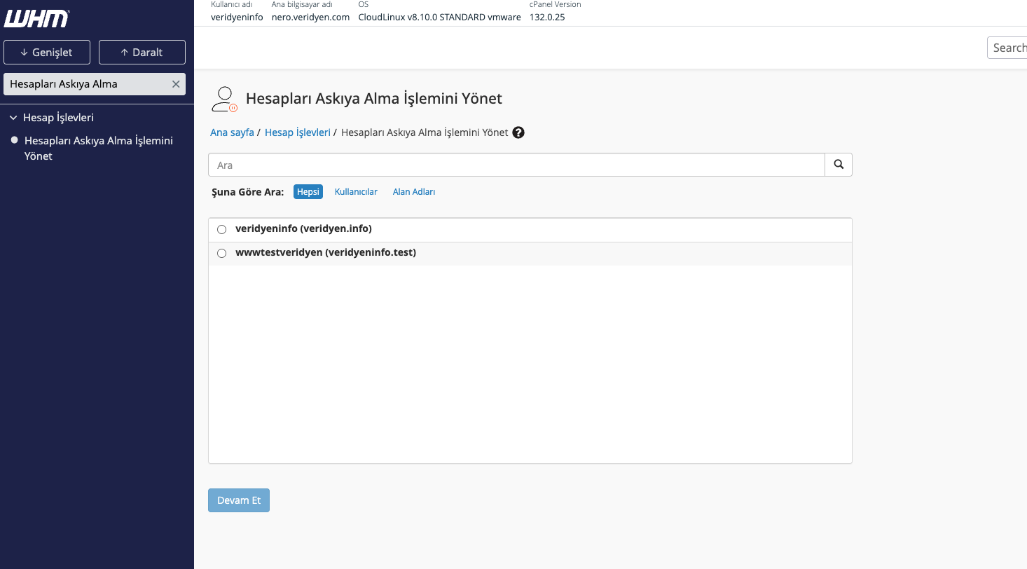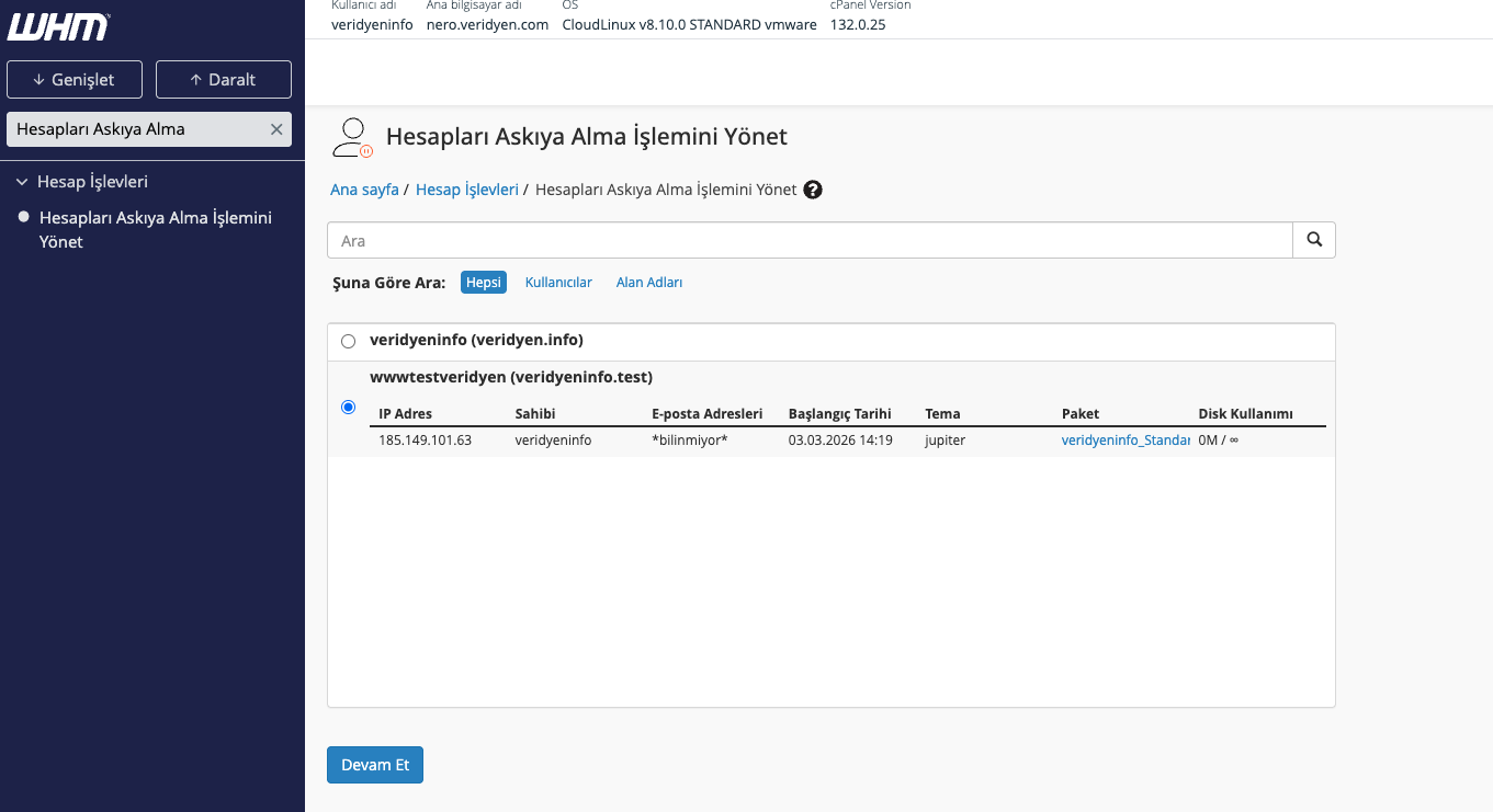 WHM Üzerinde Hesap Askıya Alma ve Askıdan Kaldırma (Suspend / Unsuspend)