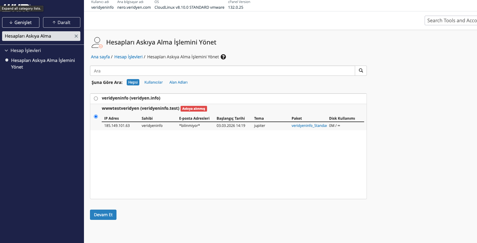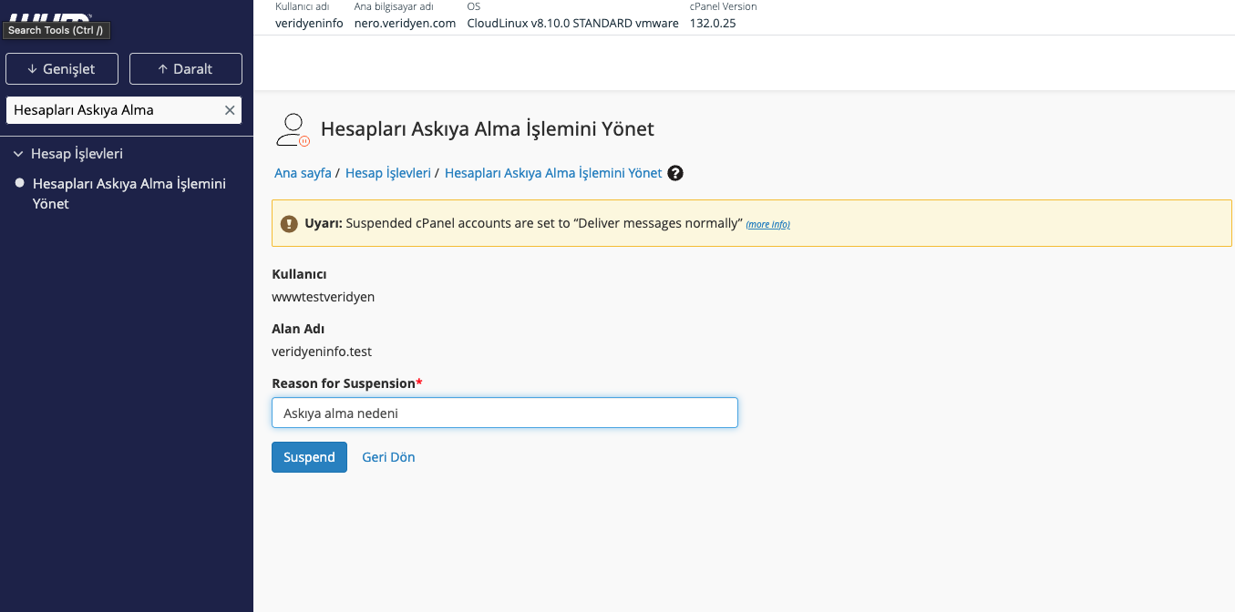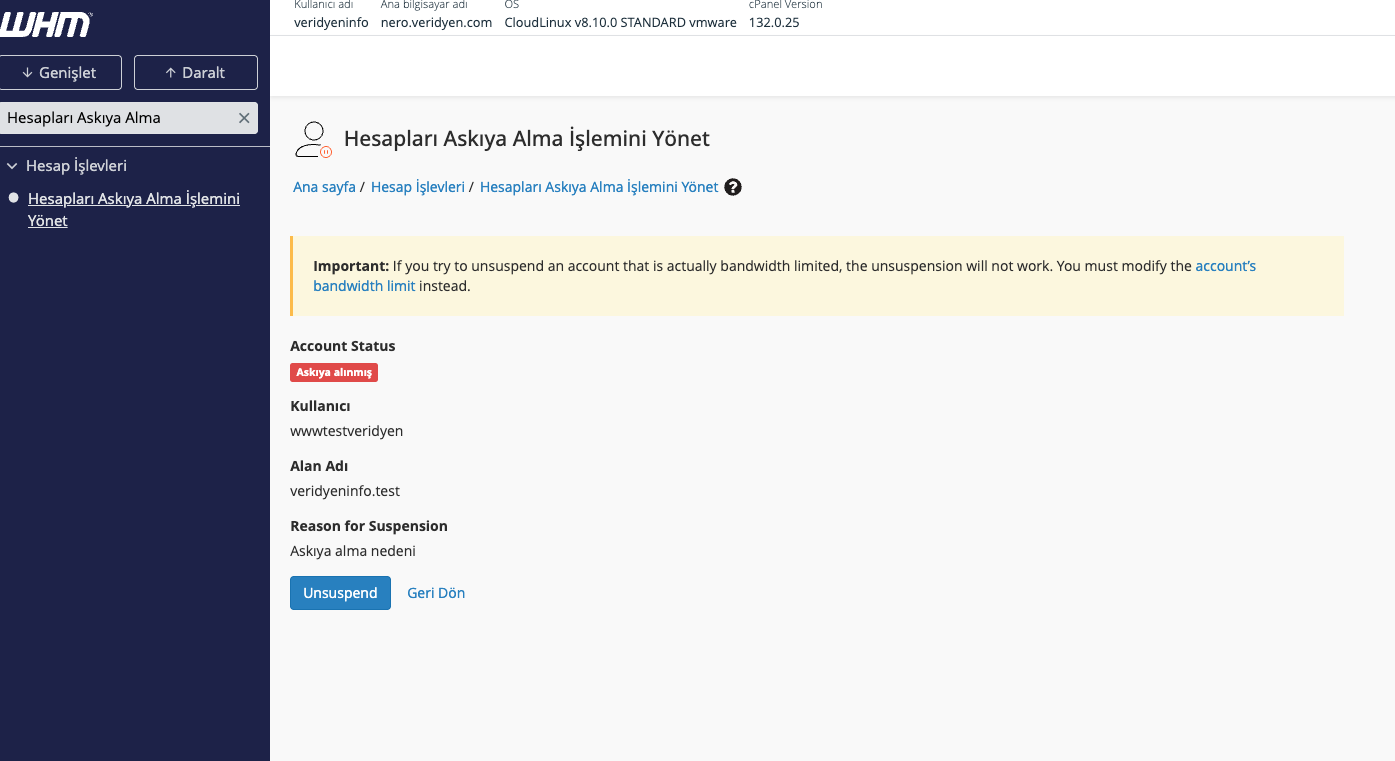 Askıya alınan bir hesabı tekrar aktif hale getirmek için aynı menüde Unsuspend Account seçeneğini kullanın.