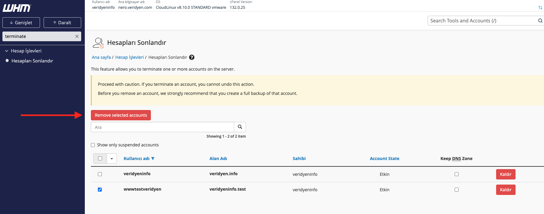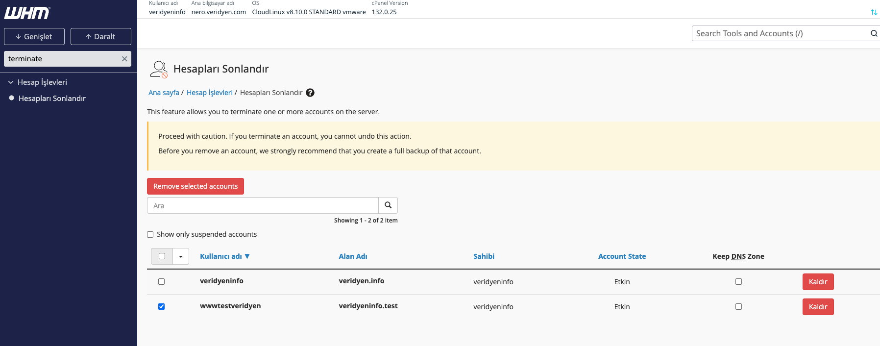 Ana hosting hesapları silinememektedir. Bu nedenle WHM panelinizin ana hesabını silerken hata alırsınız.