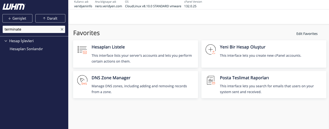 İpucu: Alan adınızın sonuna /whm yazarsanız veya :2086 yazarsanız sizi giriş yapacağınız adrese yönlendirecektir. Örneğin; veridyen.info/whm veya veridyen.info:2086